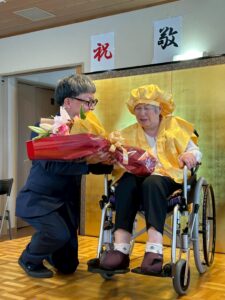 国民の祝日の一つ敬老祭を開催しました。多年にわたり社会につくしてきた方を敬愛し、長寿を祝う日であります。米寿を迎えられた入居者様達に、賞状や記念品を贈らせて頂きました。「ありがとう」と感極まり涙を流しておられました。
