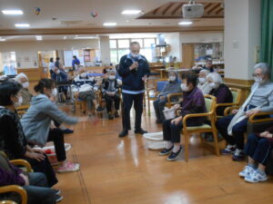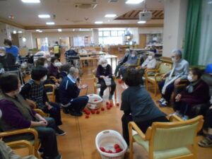 今週の余暇活動では、運動の秋をテーマに「玉渡しゲーム」を行いました。職員が玉入れの球を投げ、利用者様 が桶で受けるゲームですがお互いの呼吸が合わないと上手くキャッチ出来ません。