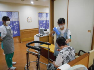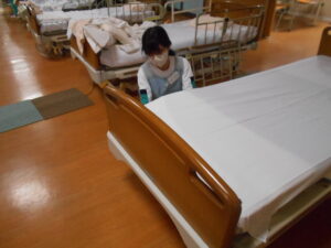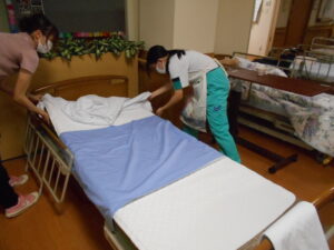 入浴後の髪のドライヤーや、ベッドのシーツ交換を職員と一緒に行いました