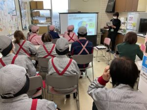スーパーマーケットでの売り場対応のDVDを観ていただき、具体的な対応の仕方として認知症の方への接し方として「3つのない」驚かせない、急がせない、(自尊心を)傷つけないを意識した対応をお伝えしました。