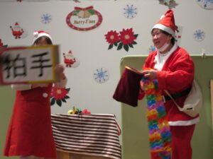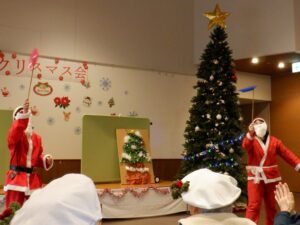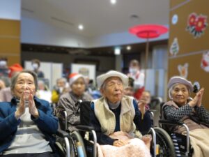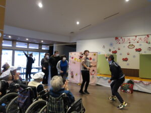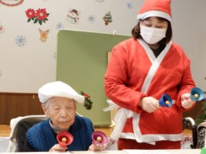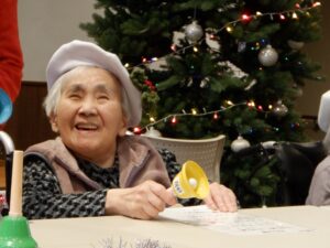 今回のクリスマス会では、入所者様と職員がこの日の為に練習を重ねたハンドベル演奏がありました。みんなで心をひとつにし、素敵な音色を響き渡らせました