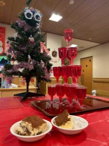 入居者様の誕生日を祝ってシャンパンタワーならぬ、ジュースタワーでお祝いさせて頂きました。サイダーに、かき氷シロップを入れて赤くしシャンパンに見立ててみました。男性スタッフがスーツを着てホストとなり準備しました