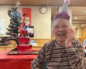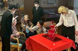入居者様の誕生日を祝ってシャンパンタワーならぬ、ジュースタワーでお祝いさせて頂きました。サイダーに、かき氷シロップを入れて赤くしシャンパンに見立ててみました。男性スタッフがスーツを着てホストとなり準備しました