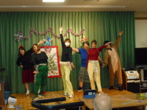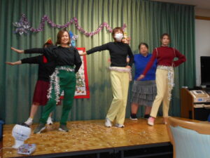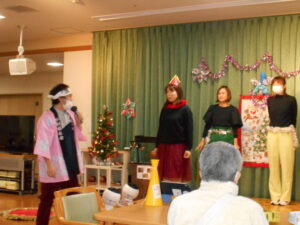 クリスマス週間の1日で、職員による歌と踊りを披露しました。美空ひばりさんの「真っ赤な太陽」に合わて踊ると利用者の方も一緒に体を動かされ笑い声や笑顔が溢れていました