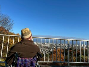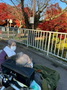 11月中頃に呉羽山公園展望台へ行きました。紅葉真っただ中で紅葉と、青空で素晴らしい景色となっておりました。「さむなったけど、こんないい景色見れたわ」と話しておられました。入居者様、私たちスタッフの良い息抜きとなりました。