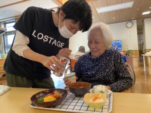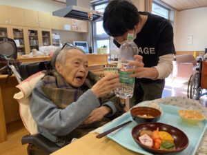 1日、昼食におせち料理が振る舞われ「おめでとう」の乾杯から始まりました1年に一度のおせち料理に舌鼓を打っておられました。