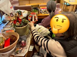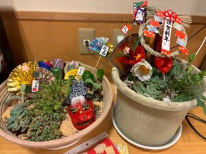 また、観葉植物などを使って門松を作りました。植物の配置や、飾りの配置などのバランスにとても悩んでおりました。「これどうかね~?」と二人で考えておられました。最後には正月らしい素晴らしい作品となりました!