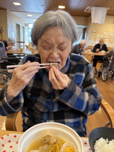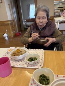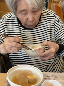 2月の特別食はおでんでした 具材は大根、卵、ハンペン、里芋、カニつみれ、がんもどき、焼き豆腐と盛りだくさん! 「家ではよく作って食べていたから良かった~」 「体が温まったわ」 「美味しくて汁まで飲み干した」など、皆さま味の染みた熱々のおでんに喜んでおられました