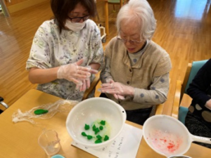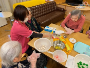 2月のユニット活動として、利用者様と一緒に涅槃団子づくりを行いました🍡 色とりどりの団子を手に取りながら、