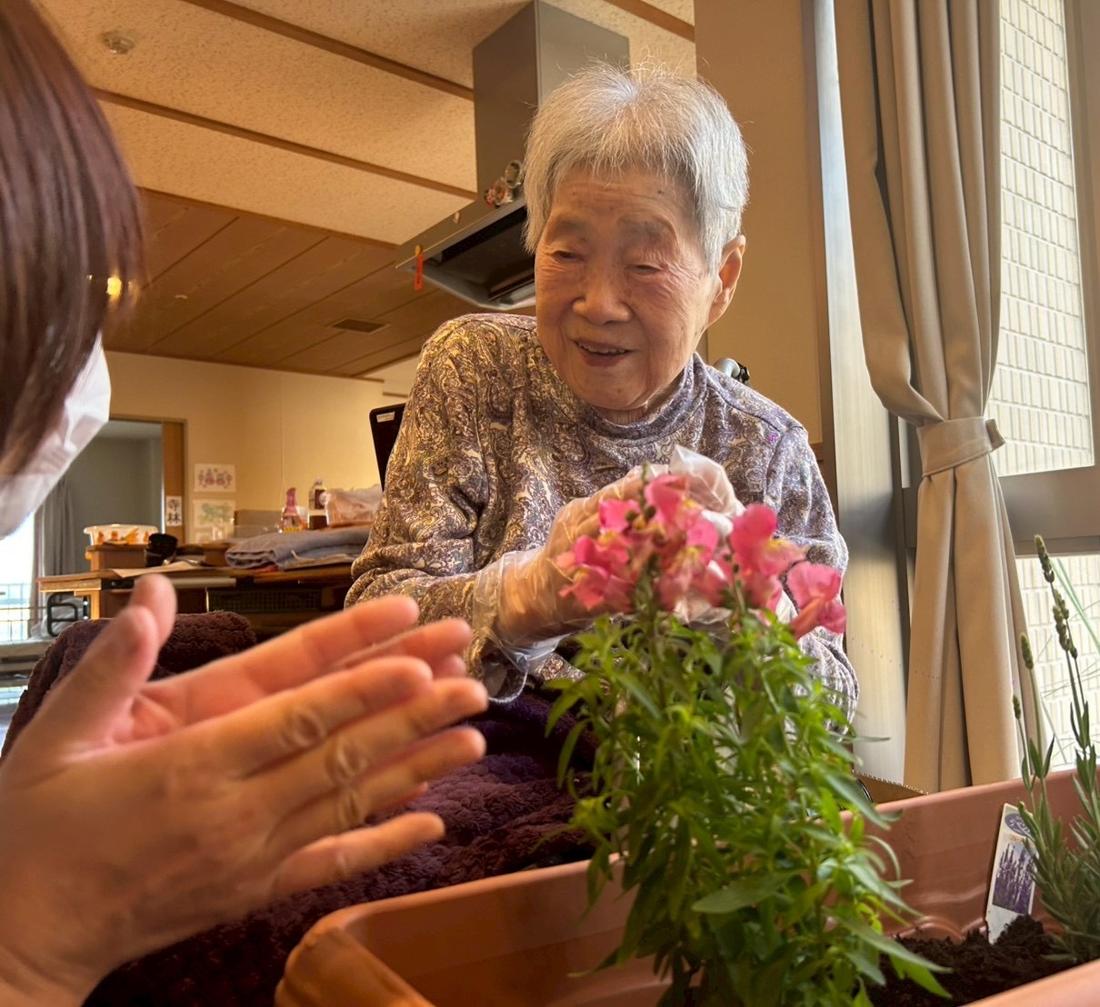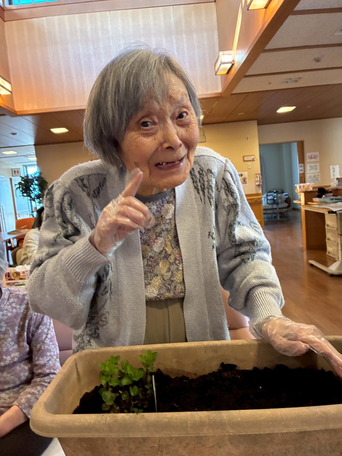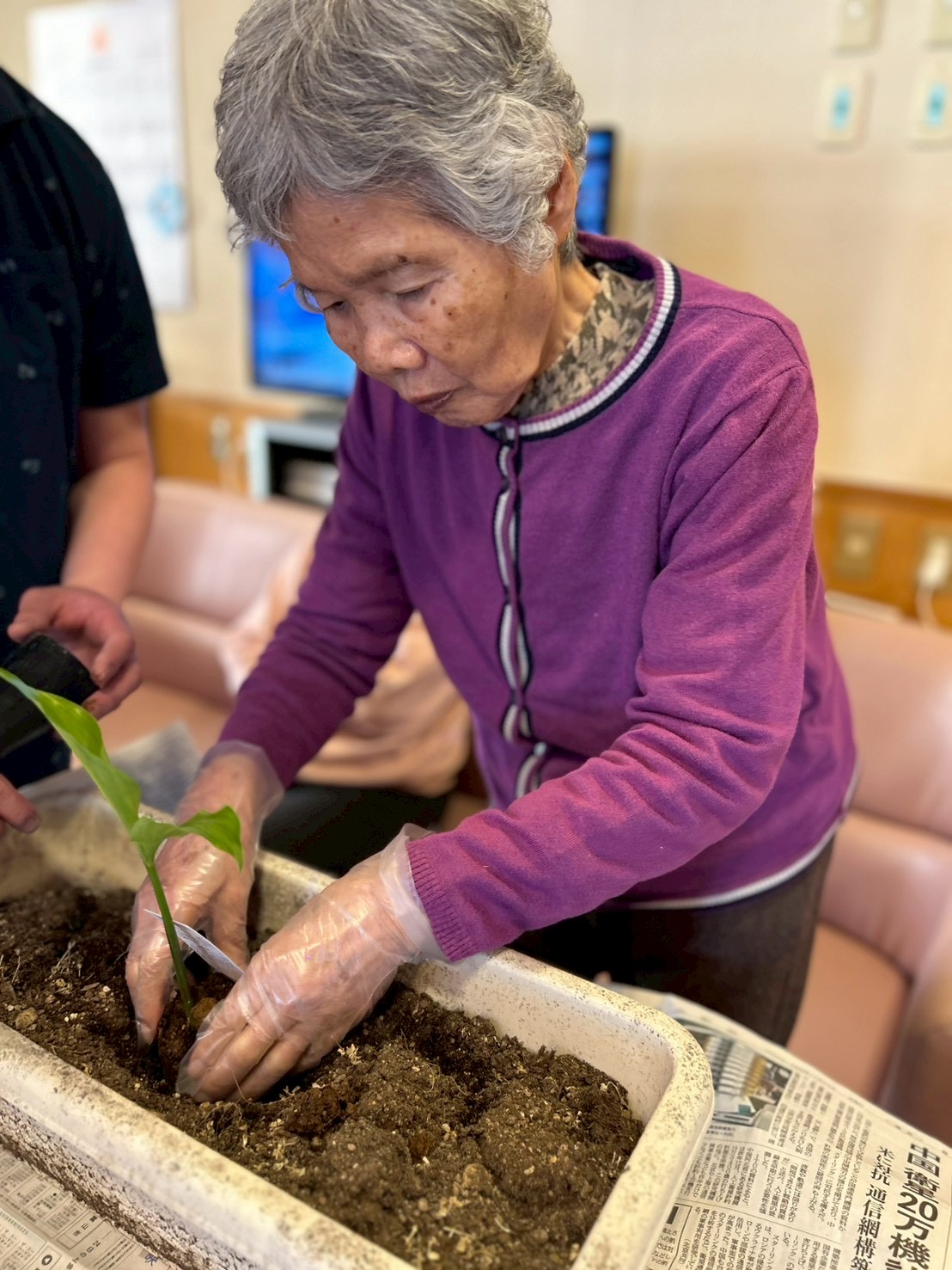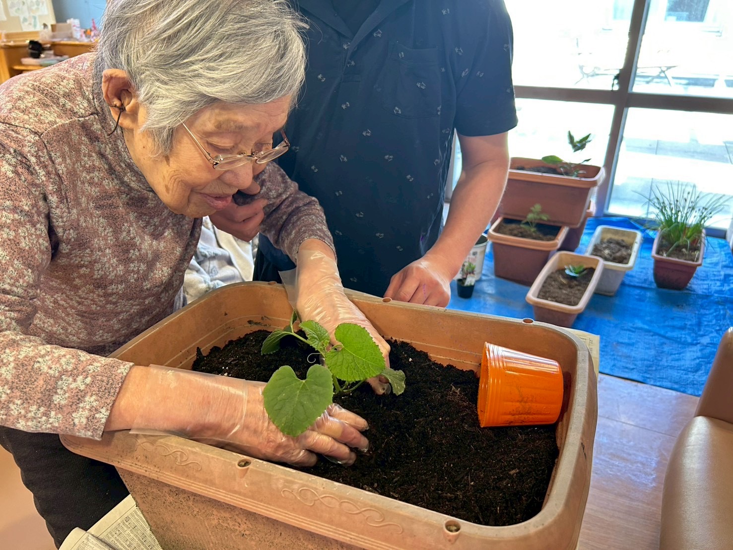 前回に続き花、苗の植え替えを手伝っていただきました。「ここやね、もう少し土入れんなんね」と手際よく行って下さいました。また、「あちゃ綺麗やね何の花やろか?」と話してくださいました。引き続き成長の過程を入居者様と共に、見守っていきたいと思っております。