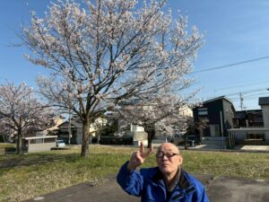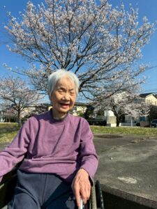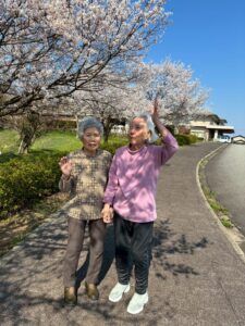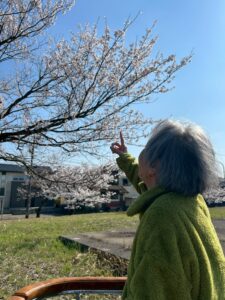 新しい学校や職場での生活が始まる時期となりました。この日は最高気温20℃という雲一つない快晴苑内散歩に出掛けました。苑内の桜は満開となっており入居者様は「きれいやわ~」、「気持ちいね~」と見上げておられました。