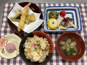 桜の花があしらわれた筍ご飯や桜餅など春ならではのお料理が出来上がりました