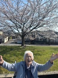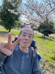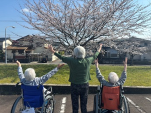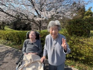 窓から見える青空と桜の木に誘われ、利用者様と一緒に外へ散歩に出掛けました。
