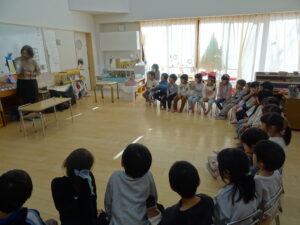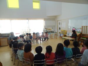 年に数回、保護者会主催で『おはなしの会』があり、園におはなしの会の方々が来てくださります。 それぞれの年齢ごとに合わせ、いろいろなお話をしてくださり、子どもたちは興味津々に夢中でお話を聞いたり、見たりしています。子どもたちは毎回とても楽しみにしています!