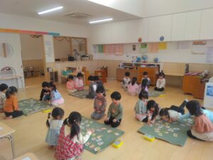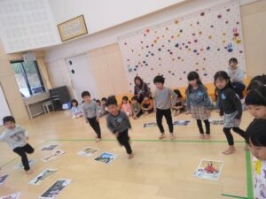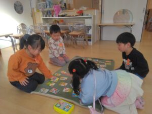 各年齢ごとにカルタをしました。自分たちで準備をして、ルールを守って楽しみました。何回かやっているうちに、読み札を覚えてきた人もいるので 取るスピードもだんだん速くなってきた子どもたち。今日は何枚取れたかな~☺?! そのあとは、遊戯室へ移動して、あいあいオリジナルジャンボカルタに挑戦!!普通のカルタとはまた違って、全身を使って取る面白さに、子どもも大人もみんなで大盛り上がりでした!!