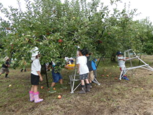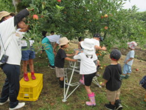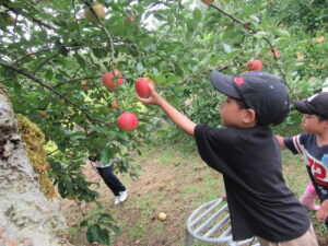 年長児さんで、りんご狩りに行ってきました。園長からりんごの採り方の話を聞き、「赤いりんご、どれかな~」と、じっくりと選んでいました。 中には、これだ!と決めて、はしごに上ったものの、近くで見ると「やっぱり違うりんごにする」と、選び直す人もいました。 自分で採ったりんごを友達同士で見せ合って「大きいね」「美味しそう!」と楽しそうに話していました。
